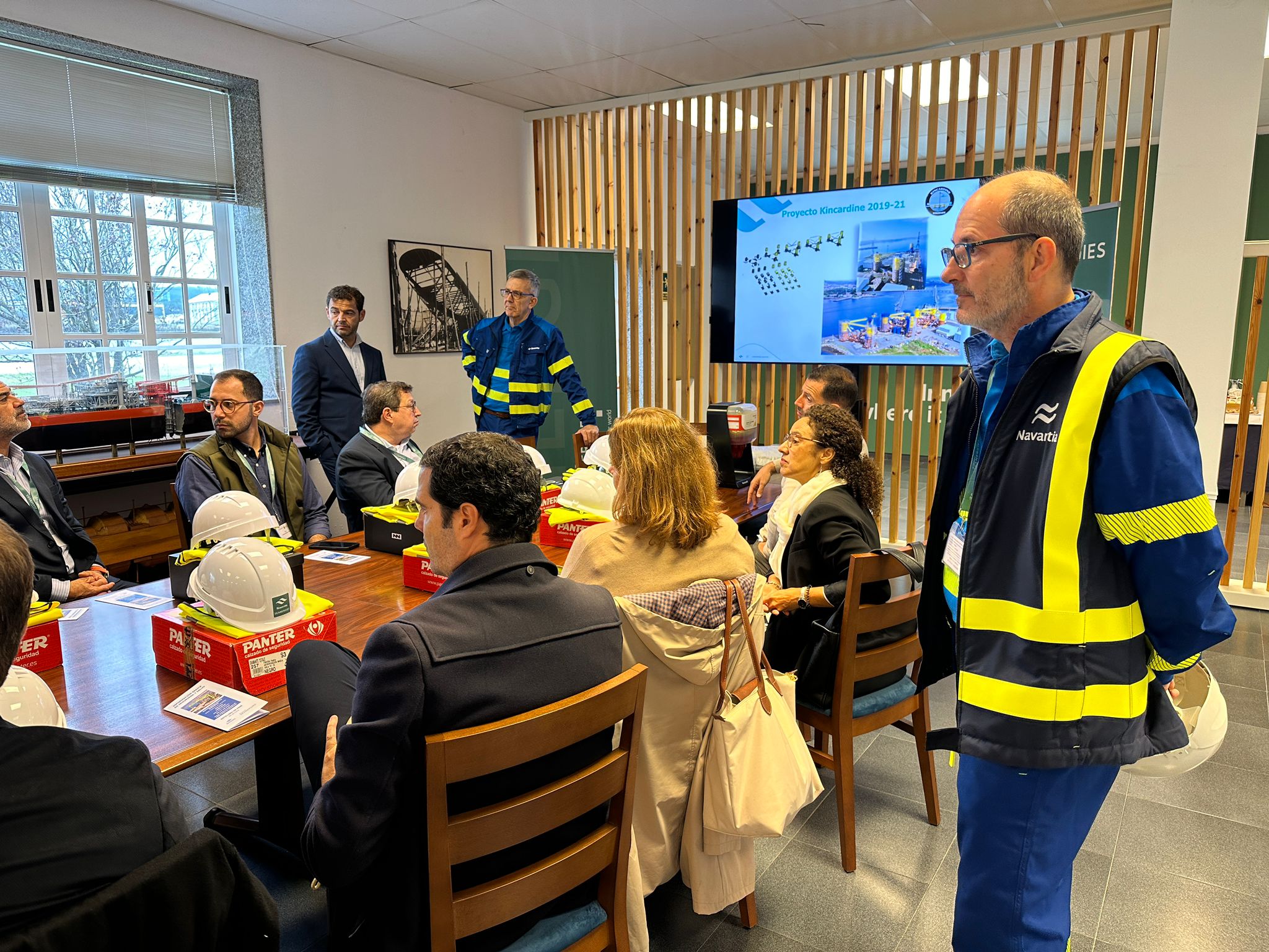 En el recorrido participaron el viceconsejero de Economía e Internacionalización del Gobierno de Canarias, Gustavo González de Vega; y la viceconsejera de Transición Ecológica, Lucha contra el Cambio Climático y Energía, Julieta Schallenberg; así como representantes de las Autoridades Portuarias de Tenerife y de Las Palmas, de la empresa pública para la internacionalización empresarial Proexca (Sociedad Canaria de Fomento Económico), del Cluster Marino Marítimo de Canarias y de asociaciones de empresas portuarias, del metal, de reparaciones navales y de pequeñas y medianas empresas. Por parte de Navantia, acompañaron a la comitiva Carlos Pascual, jefe de programa de plataformas flotantes; y Ángel Fernández, responsable comercial de monopiles y de estrategia competitiva.